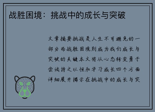 战胜困境并不容易,但正是在挑战中,我们不断成长,不断突破自我。通过调整心态、勇于尝试、持之以恒和学习成长,我们可以更好地应对挑战,实现自身的成长与突破。