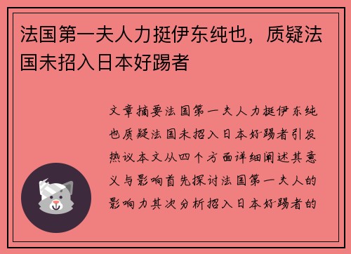 文章摘要:法国第一夫人力挺伊东纯也,质疑法国未招入日本好踢者,引发热议。本文从四个方面详细阐述其意义与影响。首先探讨法国第一夫人的影响力,其次分析招入日本好踢者的必要性,然后讨论足球文化间的交流与融合,最后强调体育与政治的紧密关系。通过深度分析,揭示此事带来的深远影响。