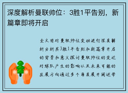 全文将对曼联帅位变动进行深度解析,分析其3胜1平告别和新篇章开启的背景和意义。探讨曼联帅位的变迁对球队产生的影响,以及未来可能的发展方向。通过多个角度展开阐述,带领读者深入了解这一重要时刻的内涵。
